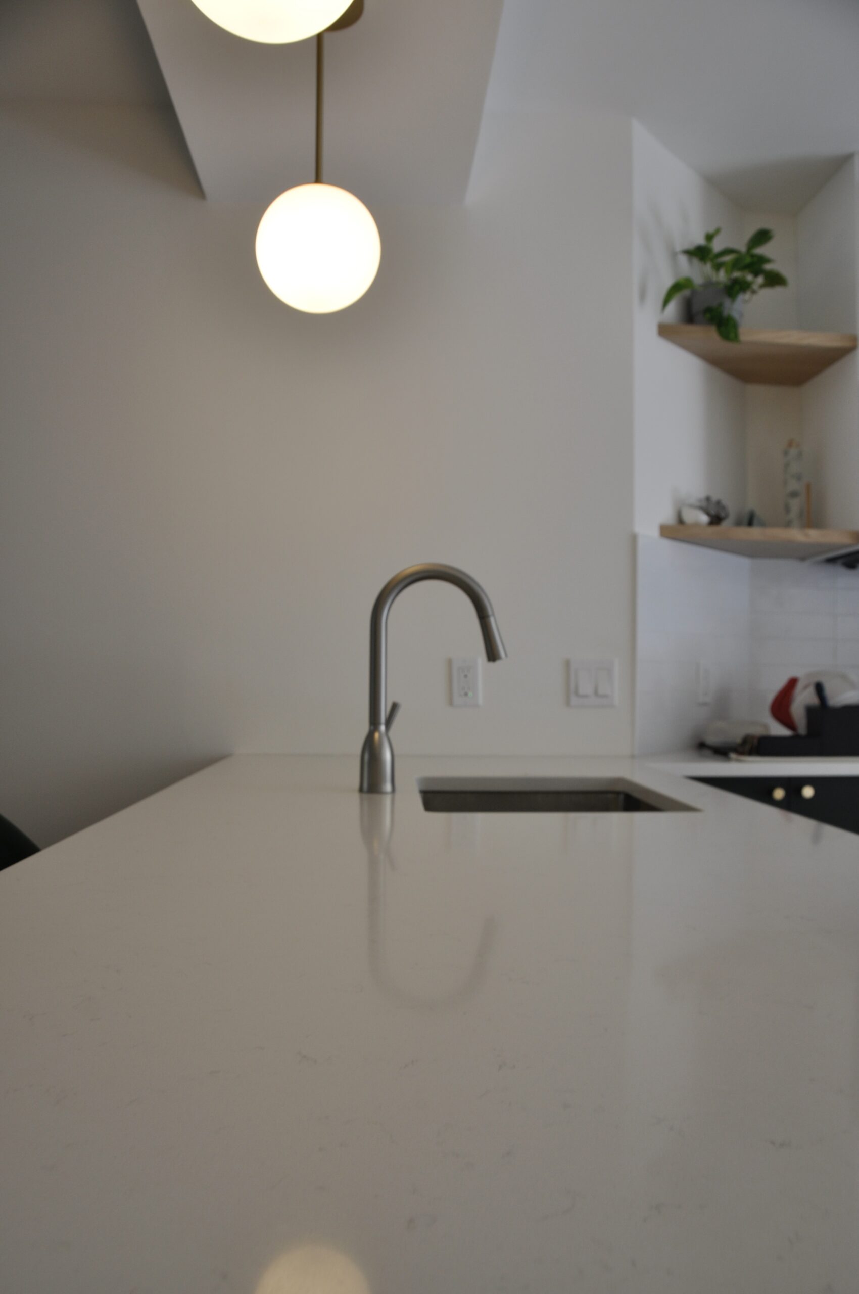 Comptoir en quartz clair, un choix durable qui apporte luminosité et simplicité d’entretien.